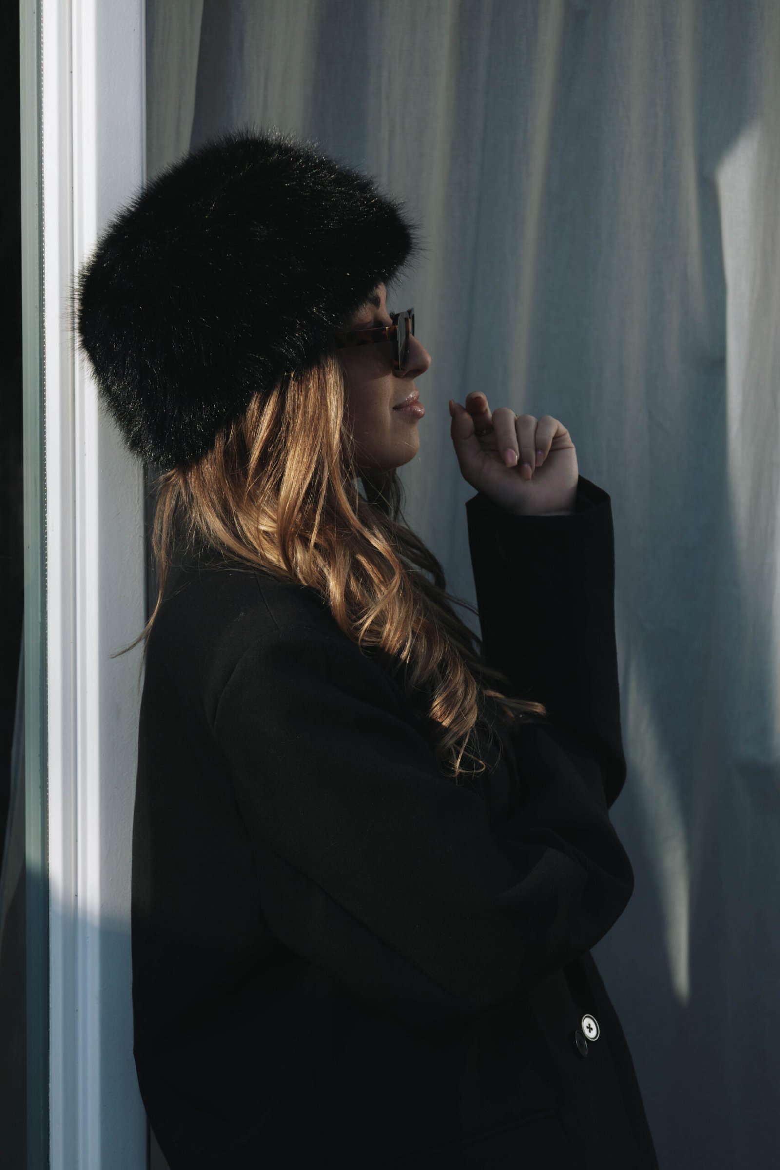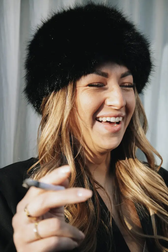 Met natuurlijk licht in de tuin en details als een sigaret en een Scandinavische bontmuts kreeg de shoot een uitgesproken vintage en gedurfde sfeer — een vleugje Russische elegantie, eigenzinnig en krachtig.